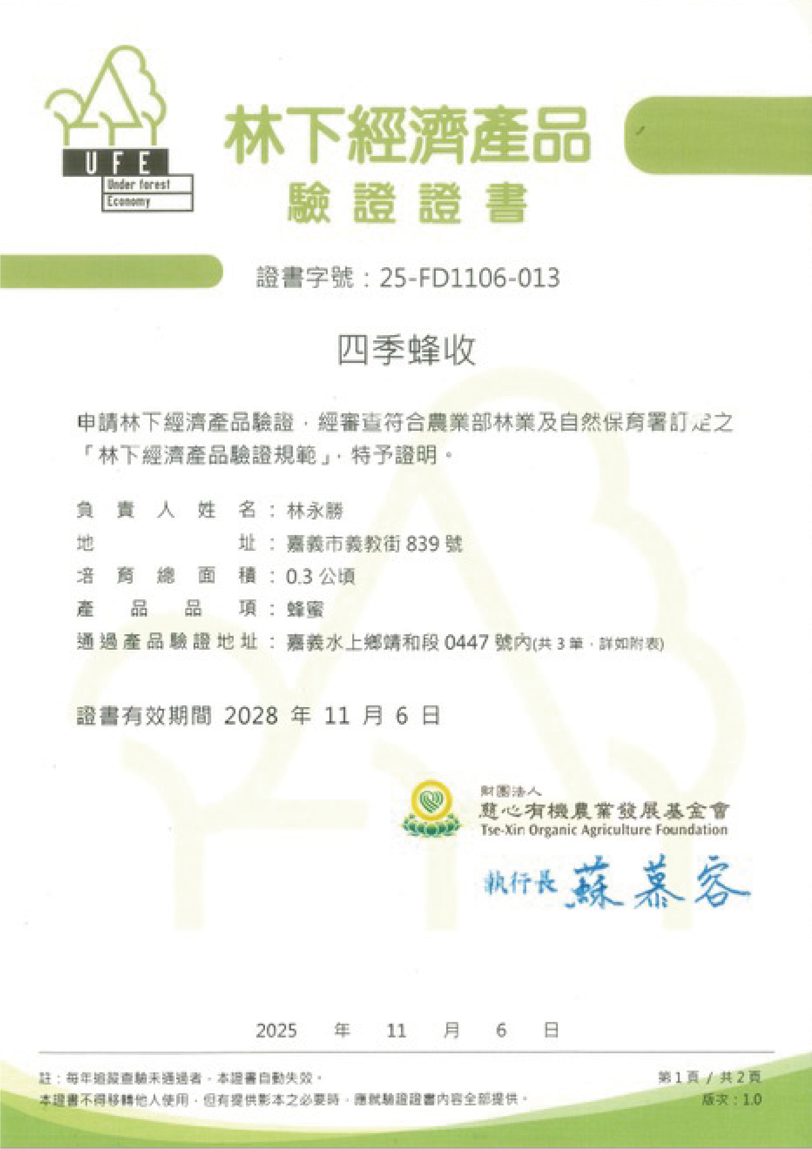 雖然一開始隨著養蜂環境的大幅改變,產生了一段技術上的撞牆期,但在林地豐富生態的陶冶下,我們逐漸學習到了與蜜蜂、自然環境全新的相處關係。林地為蜜蜂與蜂農形成了應對環境衝擊天然的庇護所,也提供了風味獨特且純淨的蜜源,更讓我們學會了觀察如何與環境互動,保護蜜蜂與蜂蜜不受污染。109年農業部首次公告蜂蜜產銷履歷驗證制度,我們靠著這份經驗成為全國首批通過驗證的個人戶蜂農。